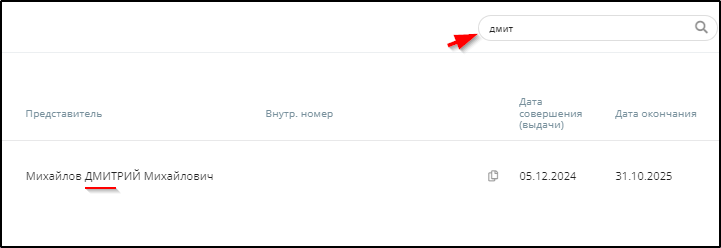 Для поиска доверенности в списках разделов "Подписанные", "На подписании", "Черновики" можно использовать поле поиска, введя в него частично или полностью: