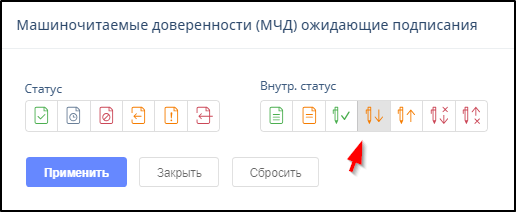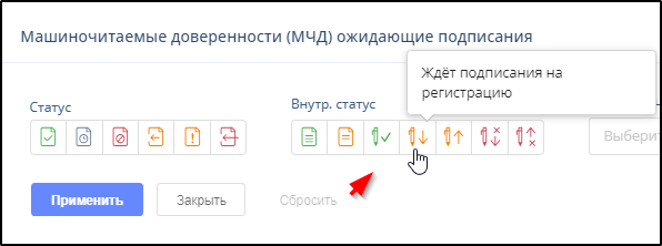При наведении курсора на кнопку фильтра по статусам отображается расшифровка статуса.
